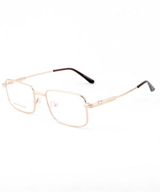 armação óculos grau atacado Material de metal na cor dourado com lente de acrílico. Modelo frontal no formato quadrado e aro fechado parafusado, ponte de metal e plaqueta de silicone na cor transparente. Hastes de metal na cor dourado com mola flexível que permite uma abertura de até 90 graus, que se ajusta ao rosto e ponteira de acetato na cor marrom para proporcionar conforto e segurança atrás da orelha. Armação com acabamento brilhante.
