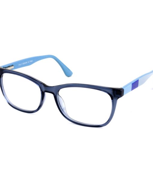 armação óculos grau atacado Material de acetato na cor azul e lente de acrílico. Modelo frontal no formato retangular e aro fechado, ponte de silicone e plaqueta de silicone. Hastes na cor azul claro, que se ajusta ao rosto e ponteira de acetato para proporcionar conforto e segurança atrás da orelha. Óculos Infantil com acabamento brilhante.