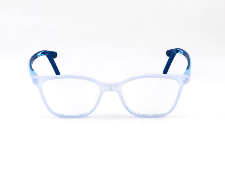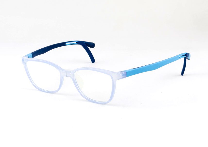 armação óculos grau atacado Material de silicone flexível na cor azul claro e lente de acrílico. Modelo frontal no formato retangular e aro fechado, ponte de silicone e plaqueta de silicone. Hastes de silicone flexível na cor azul claro com mola flexível que permite uma abertura de até 90 graus, que se ajusta ao rosto e ponteira de acetato para proporcionar conforto e segurança atrás da orelha. Óculos Infantil com acabamento brilhante.