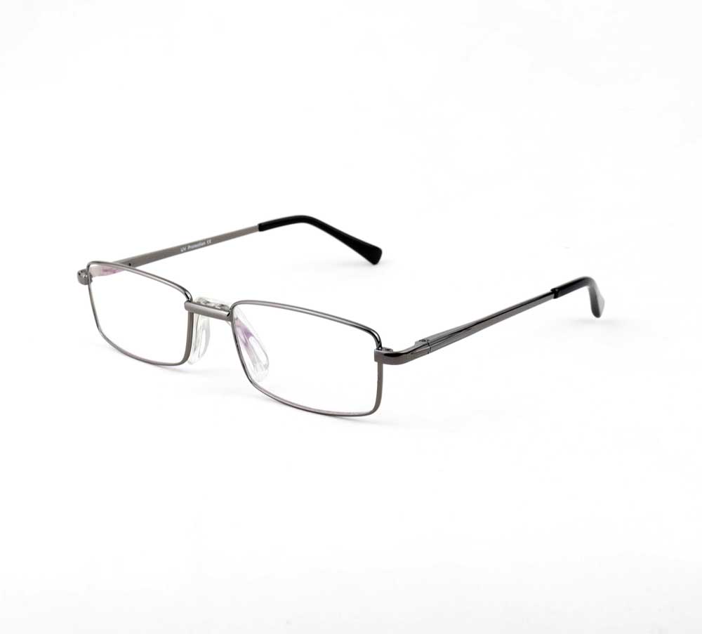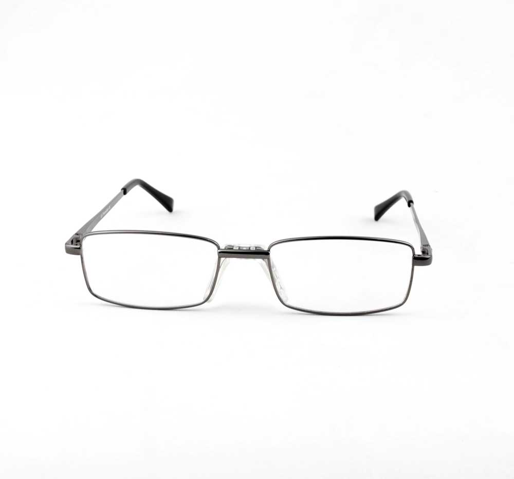 armação óculos grau atacado Material de metal na cor chumbo com lente de acrílico. Modelo frontal no formato retangular e aro fechado parafusado, ponte de metal e plaqueta de silicone na cor transparente. Hastes de metal na cor chumbo com mola flexível que permite uma abertura de até 90 graus, que se ajusta ao rosto e ponteira de acetato na cor preto para proporcionar conforto e segurança atrás da orelha. Armação com acabamento brilhante.