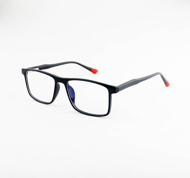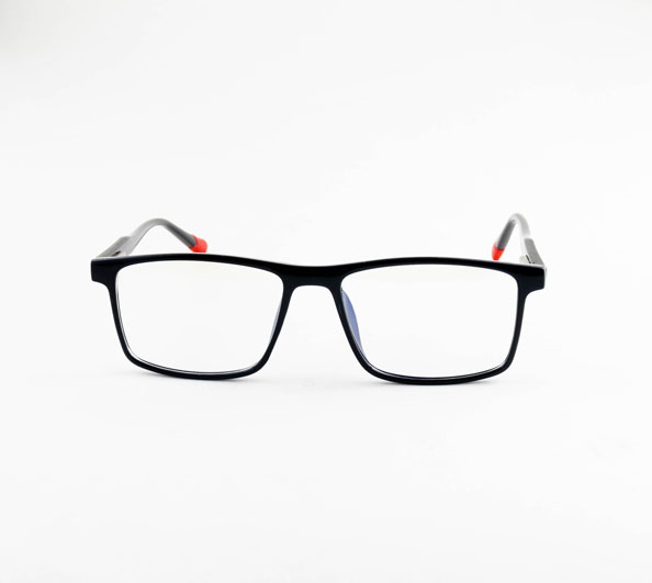 armação óculos grau atacado Material de acetato na cor preto com vermelho e lente de acrílico. Armação, modelo frontal no formato retangular e aro fechado na cor preto.