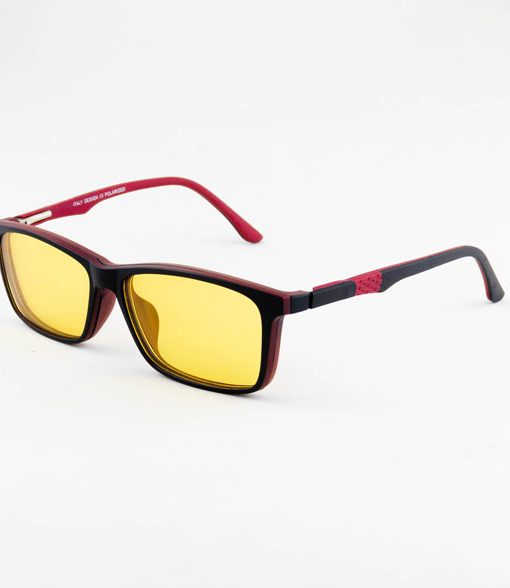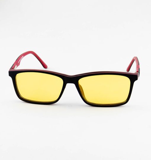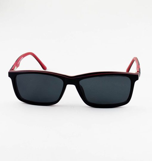 óculos solar atacado Clipon masculino no material de acetato tr90 na cor preto com vermelho e lente de acrílico com acabamento brilhante.