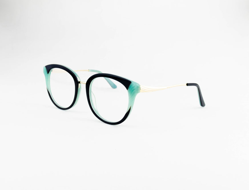 armação óculos grau atacado Material de acetato chapa na cor verde e mescla e lente de acrílico. Armação, modelo frontal no formato redondo e aro fechado na cor verde, ponte de acetato e plaqueta de acetato. Hastes de metal na cor dourado e mola flexível que permite uma abertura de até 90 graus, que se ajusta ao rosto e ponteira de acetato para proporcionar conforto e segurança atrás da orelha. Armação com acabamento brilhante.