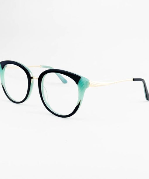 armação óculos grau atacado Material de acetato chapa na cor verde e mescla e lente de acrílico. Armação, modelo frontal no formato redondo e aro fechado na cor verde, ponte de acetato e plaqueta de acetato. Hastes de metal na cor dourado e mola flexível que permite uma abertura de até 90 graus, que se ajusta ao rosto e ponteira de acetato para proporcionar conforto e segurança atrás da orelha. Armação com acabamento brilhante.
