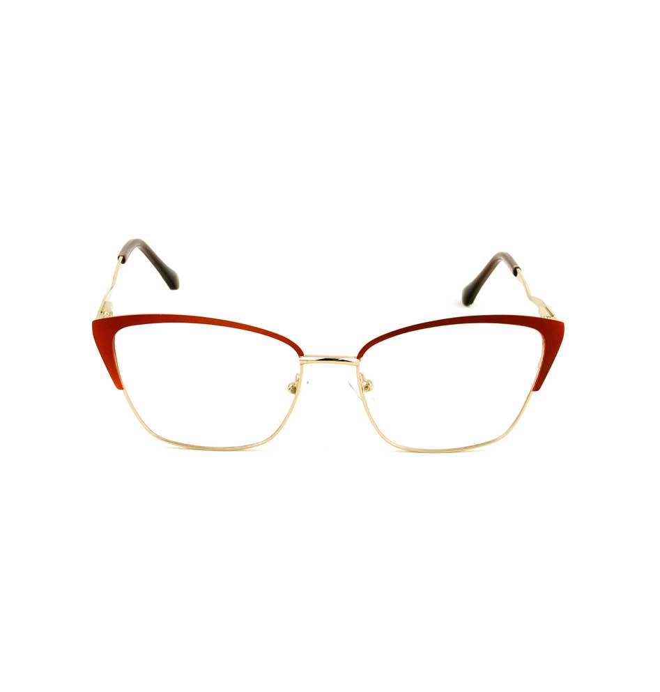 armação óculos grau atacado Material de metal na cor dourado com vermelho e lente de acrílico. Modelo frontal no puxadinho de gatinho, formato retangular e aro fechado parafusado, ponte de metal e plaqueta de silicone na cor transparente. Hastes de metal na cor dourado com mola flexível que permite uma abertura de até 90 graus, que se ajusta ao rosto e ponteira de acetato na cor vermelho para proporcionar conforto e segurança atrás da orelha. Armação com acabamento brilhante.