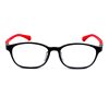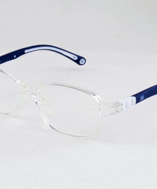 armação óculos grau atacado Acetato na cor transparente lente de acrílico. Armação, modelo frontal no formato arredondado e aro fechado na cor azul, ponte de silicone na cor rosa e plaqueta de silicone na cor rosa. Hastes de silicone flexível nylon na cor lilás e ponteira de silicone flexível na cor lilás para proporcionar conforto e segurança atrás da orelha. Armação com acabamento brilhante.