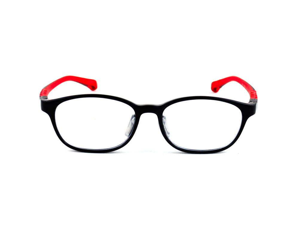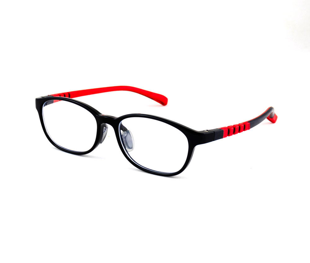 armação óculos grau atacado Material de silicone flexível na cor preto/vermelho e lente de acrílico. Modelo frontal no formato retangular e aro fechado, ponte de silicone e plaqueta de silicone. Hastes de silicone flexível na cor vermelho com mola flexível que permite uma abertura de até 90 graus, que se ajusta ao rosto e ponteira de acetato para proporcionar conforto e segurança atrás da orelha. Óculos Infantil com acabamento brilhante.