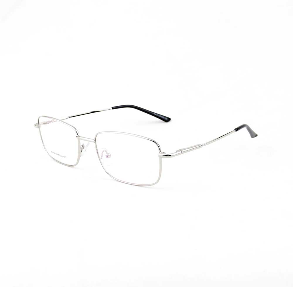 armação óculos grau atacado Material de metal na cor prata com lente de acrílico. Modelo frontal no formato retangular e aro fechado parafusado, ponte de metal e plaqueta de silicone na cor transparente. Hastes de metal na cor prata com mola flexível que permite uma abertura de até 90 graus, que se ajusta ao rosto e ponteira de acetato na cor preto para proporcionar conforto e segurança atrás da orelha. Armação com acabamento brilhante.