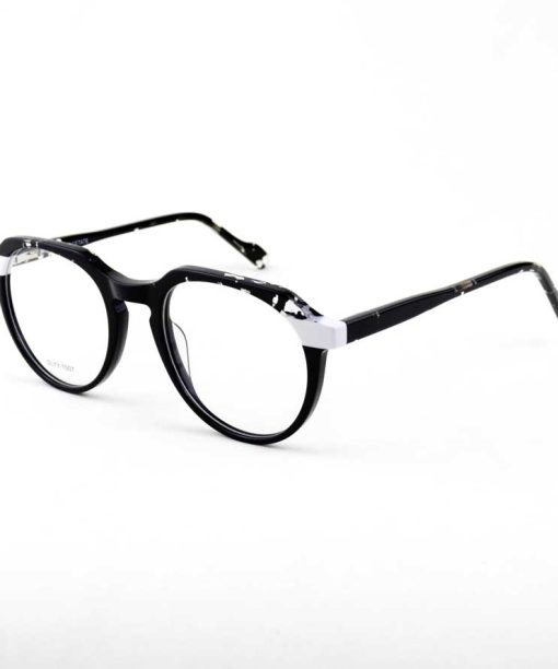armação óculos grau atacado Material de acetato chapa na cor preto com branco e lente de acrílico. Armação, modelo frontal no formato arredondado e aro fechado na cor preto com branco, ponte de acetato na cor preto e plaqueta de acetato na cor preto. Hastes de acetato chapa na cor preto com mola flexível que permite uma abertura de até 90 graus, que se ajusta ao rosto e ponteira de acetato chapa na cor preto para proporcionar conforto e segurança atrás da orelha. Armação com acabamento brilhante.