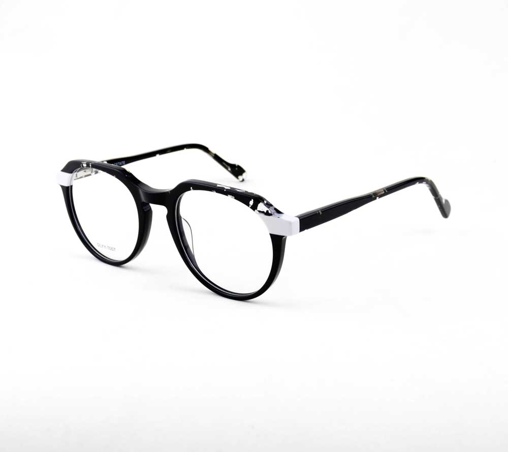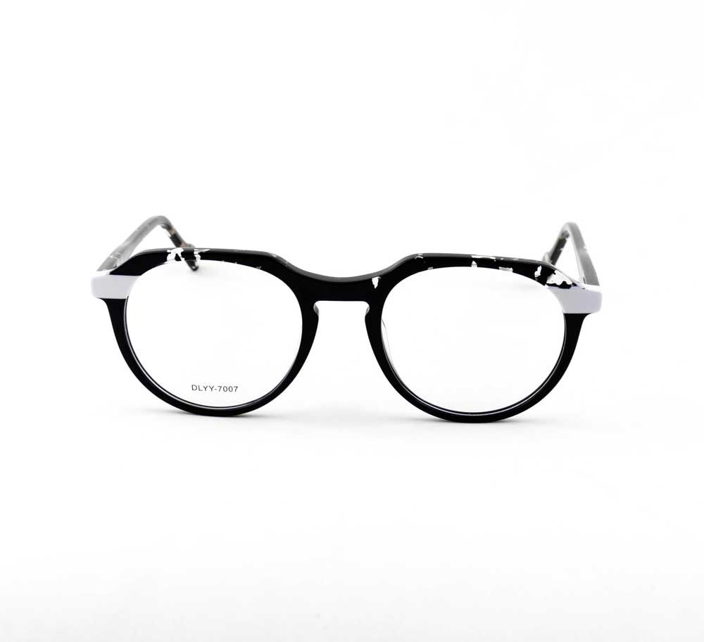 armação óculos grau atacado Material de acetato chapa na cor preto com branco e lente de acrílico. Armação, modelo frontal no formato arredondado e aro fechado na cor preto com branco, ponte de acetato na cor preto e plaqueta de acetato na cor preto. Hastes de acetato chapa na cor preto com mola flexível que permite uma abertura de até 90 graus, que se ajusta ao rosto e ponteira de acetato chapa na cor preto para proporcionar conforto e segurança atrás da orelha. Armação com acabamento brilhante.