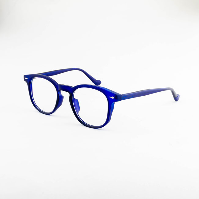 armação óculos grau atacado Material de acetato TR-90 e alumínio na cor azul escuro e lente de acrílico. Modelo frontal no formato redondo e aro fechado, ponte de acetato e plaqueta de acetato. Hastes de alumínio na cor azul com mola flexível que permite uma abertura de até 90 graus, que se ajusta ao rosto e ponteira emborrachado na cor azul escuro para proporcionar conforto e segurança atrás da orelha. Armação com acabamento fosco.