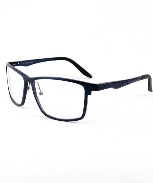armação óculos grau atacado Material de alumínio na cor azul e lente de acrílico. Modelo frontal no formato quadrado e aro fechado parafusado, ponte de alumínio e plaqueta de silicone na cor transparente. Hastes de alumínio na cor azul com mola flexível que permite uma abertura de até 90 graus, que se ajusta ao rosto e ponteira de acetato na cor preto fosco para proporcionar conforto e segurança atrás da orelha. Armação com acabamento fosco.