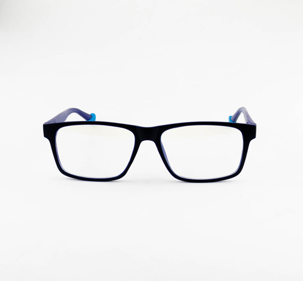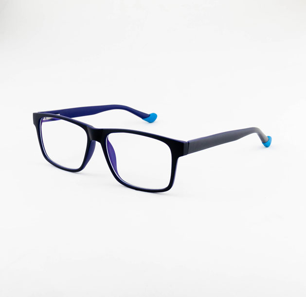 armação óculos grau atacado Material de acetato TR90 na cor preto com azul escuro e lente de acrílico. Armação, modelo frontal no formato retangular com aro fechado na cor azul escuro, ponte de acetato na cor azul escuro e plaqueta de acetato na cor azul escuro. Hastes de acetato TR90 na cor azul escuro com mola flexível que permite uma abertura de até 90º graus, que se ajusta ao rosto e ponteira de acetato na cor azul escuro para proporcionar conforto e segurança atrás da orelha. Armação com acabamento fosco.