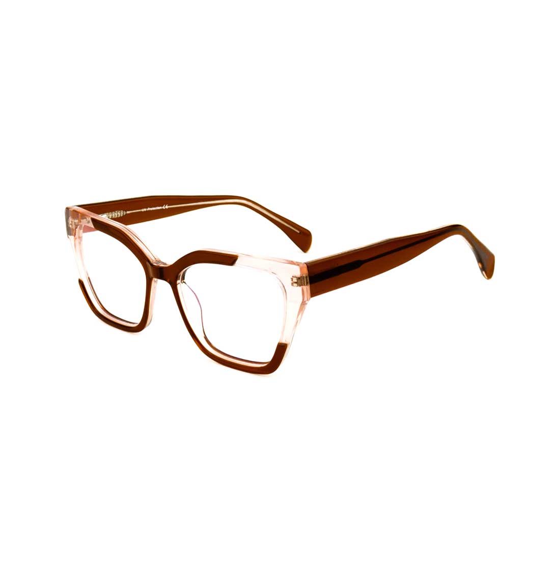 armação óculos grau atacado Material de acetato chapa brilhante na cor cristal marrom com rosa e lente de acrílico. Armação, modelo frontal no puxadinho de gatinho, formato quadrado e aro fechado na cor cristal marrom com rosa, ponte de acetato na cor cristal marrom e plaqueta de acetato na cor transparente. Hastes de acetato chapa na cor cristal marrom mola flexível que permite uma abertura de até 90 graus, que se ajusta ao rosto e ponteira de acetato chapa na cor cristal marrom para proporcionar conforto e segurança atrás da orelha. Armação com acabamento brilhante.