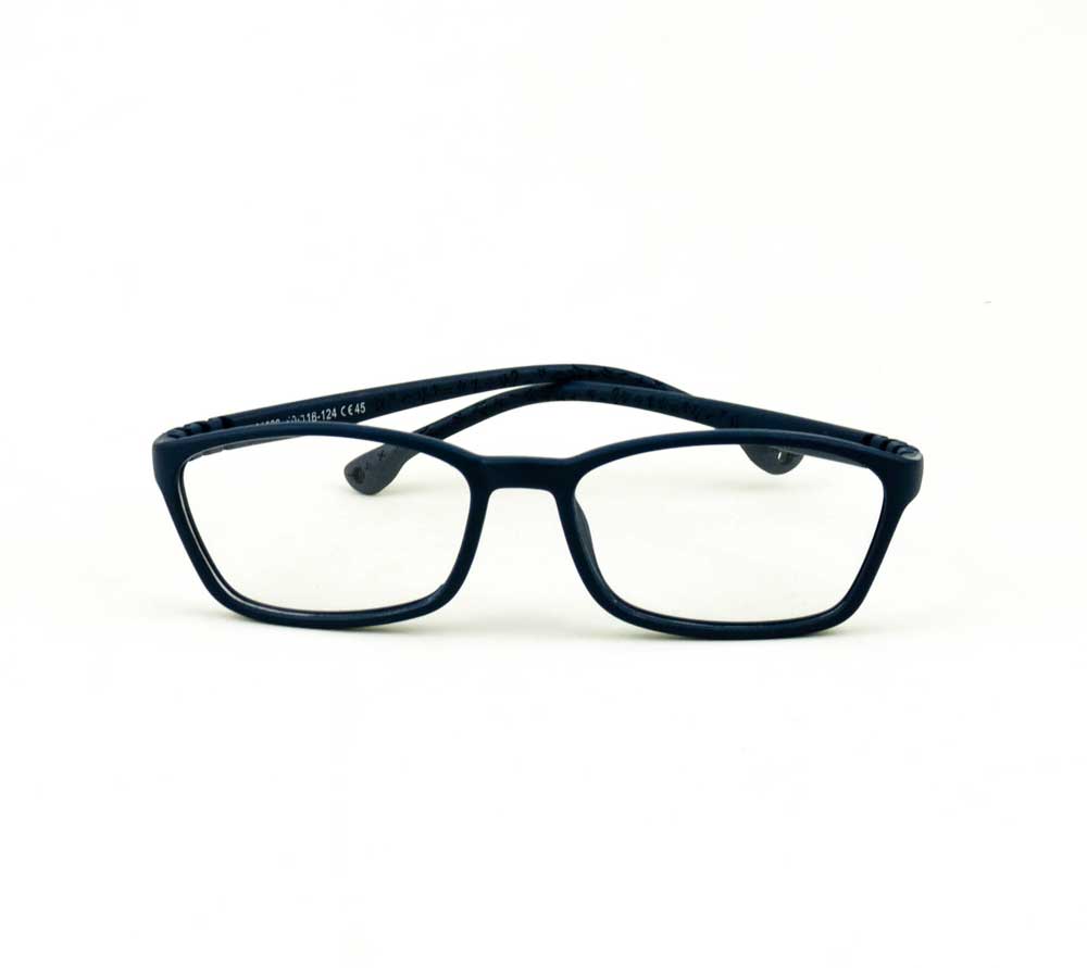 armação óculos grau atacado Material de silicone flexível nylon na cor azul escuro e lente de acrílico. Armação, modelo frontal no formato retangular e aro fechado na cor azul escuro, ponte de silicone na cor azul escuro e plaqueta de silicone na cor azul escuro. Hastes de silicone flexível na cor azul escuro e ponteira de silicone na cor azul escuro para proporcionar conforto e segurança atrás da orelha. Armação com acabamento fosco.
