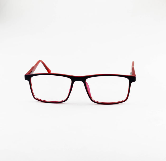 armação óculos grau atacado Material de acetato na cor preto com vermelho e lente de acrílico. Armação, modelo frontal no formato retangular e aro fechado na cor preto fosco, ponte de acetato na cor vermelho, plaqueta de acetato na cor preto fosco. Hastes de acetato na cor preto com vermelho e mola flexível que permite uma abertura de até 90 graus, que se ajusta ao rosto e ponteira de acetato na cor vermelho fosco para proporcionar conforto e segurança atrás da orelha. Armação com acabamento fosco.