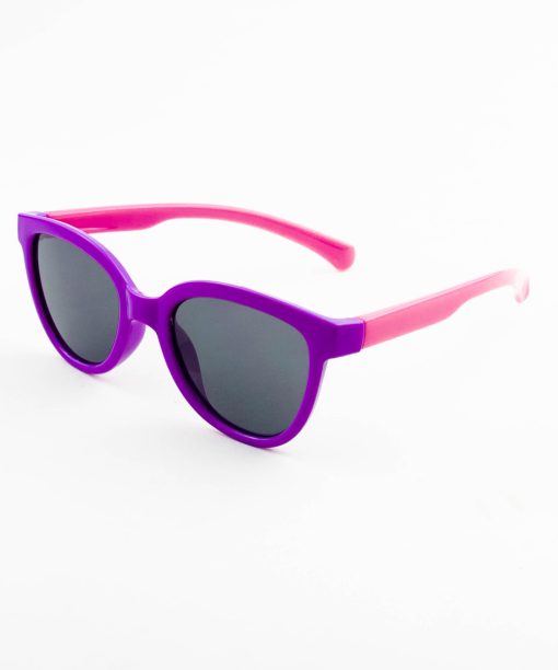 óculos solar atacado Material de silicone flexível nylon na cor roxo com lente UV400 polarizado na cor black. Solar, modelo frontal no formato retangular com aro fechado na cor roxo, ponte de silicone na cor roxo e plaquetas de silicone na cor roxo claro. Hastes de silicone flexível nylon na cor rosa e ponteira de acetato na cor rosa claro para proporcionar conforto e segurança atrás da orelha. Solar com acabamento fosco.