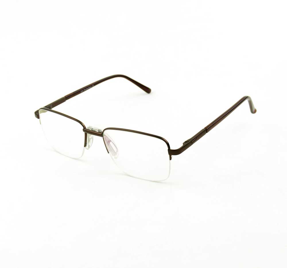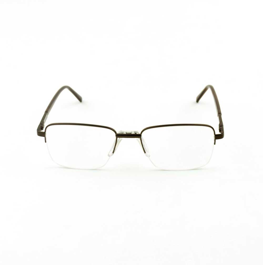 armação óculos grau atacado Material de metal na cor marrom e lente de acrílico. Modelo frontal no formato retangular e aro semiaberto com fio de nylon, ponte de metal e plaqueta anatômica na cor transparente. Hastes de metal na cor marrom com mola flexível que permite uma abertura de até 90 graus, que se ajusta ao rosto e ponteira acetato para proporcionar conforto e segurança atrás da orelha. Armação com acabamento brilhante.