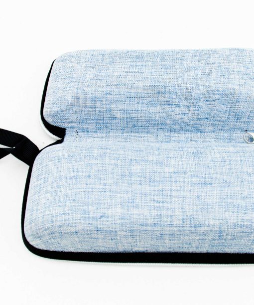 Estojo em tecido na cor Azul para óculos de sol e grau, estojo com abertura e fecho em zíper. Permite gravar a laser.
