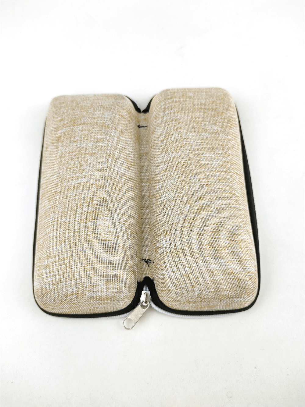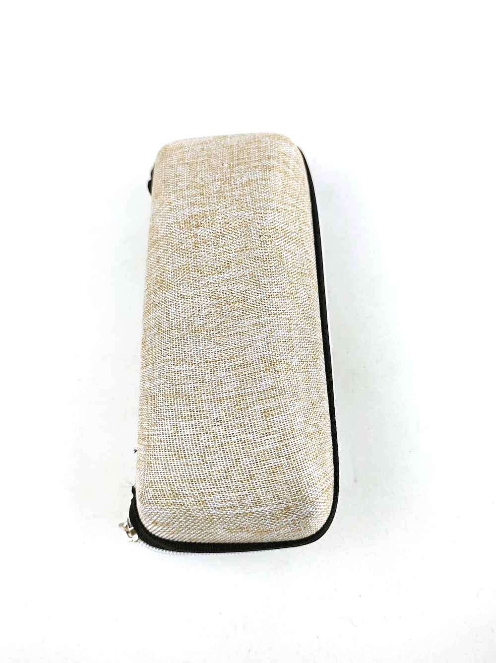 Estojo em tecido na cor Bege para óculos de sol e grau, estojo com abertura e fecho em zíper. Permite gravar a laser.