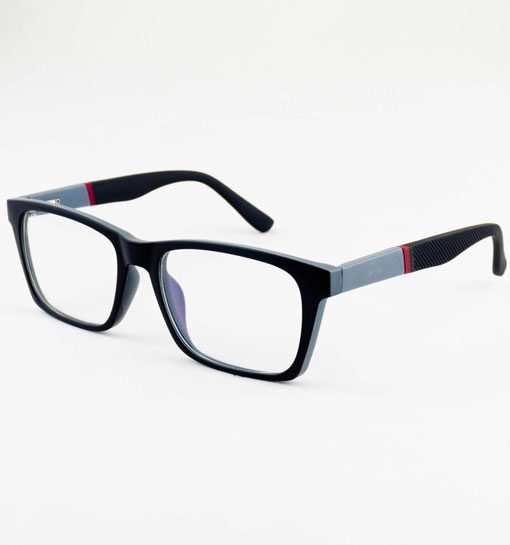 armação óculos grau atacado Material de acetato TR90 na cor preto com vermelho/grafite fosco e lente de acrílico. Armação, modelo frontal no formato quadrado e aro fechado.