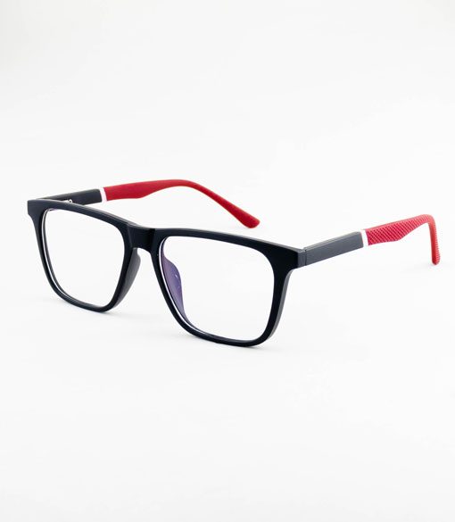 armação óculos grau atacado Material de acetato TR90 na cor preto fosco e lente de acrílico. Armação, modelo frontal no formato retangular com aro fechado na cor preto fosco, ponte de acetato na cor preto fosco e plaqueta de acetato na cor preto fosco. Hastes de acetato TR90 na cor preto fosco com vermelho com mola flexível que permite uma abertura de até 90º graus, que se ajusta ao rosto e ponteira de acetato na cor preto fosco para proporcionar conforto e segurança atrás da orelha. Armação com acabamento fosco.