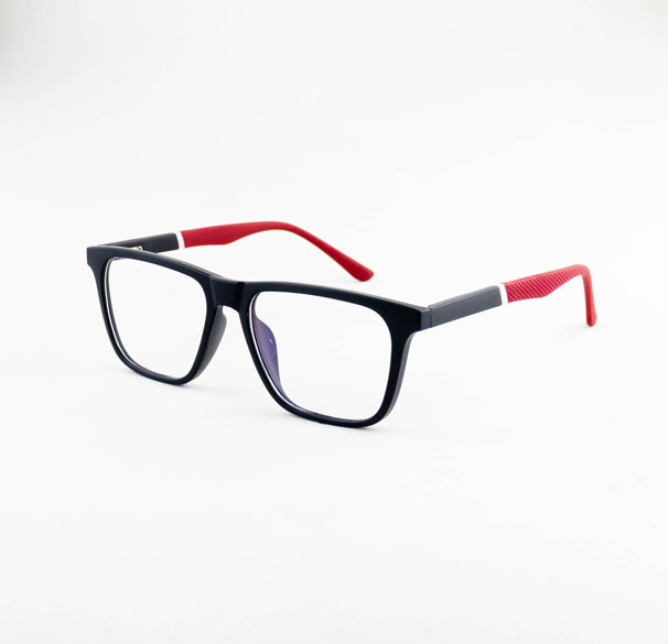 armação óculos grau atacado Material de acetato TR90 na cor preto fosco e lente de acrílico. Armação, modelo frontal no formato retangular com aro fechado na cor preto fosco, ponte de acetato na cor preto fosco e plaqueta de acetato na cor preto fosco. Hastes de acetato TR90 na cor preto fosco com vermelho com mola flexível que permite uma abertura de até 90º graus, que se ajusta ao rosto e ponteira de acetato na cor preto fosco para proporcionar conforto e segurança atrás da orelha. Armação com acabamento fosco.