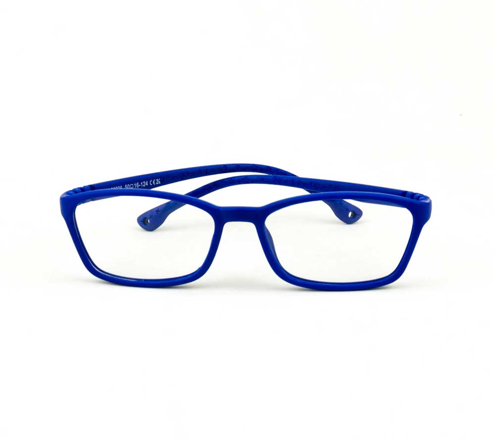 armação óculos grau atacado Material de silicone flexível nylon na cor azul e lente de acrílico. Armação, modelo frontal no formato retangular e aro fechado na cor azul, ponte de silicone na cor azul e plaqueta de silicone na cor azul. Hastes de silicone flexível na cor azul e ponteira de silicone na cor azul para proporcionar conforto e segurança atrás da orelha. Armação com acabamento fosco.