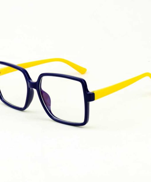 armação óculos grau atacado Material de silicone flexível na cor azul escuro com amarelo e lente de acrílico. Modelo frontal no formato retangular e aro fechado, ponte de silicone e plaqueta de silicone. Hastes de silicone flexível na cor amarelo com mola flexível que permite uma abertura de até 90 graus, que se ajusta ao rosto e ponteira de acetato para proporcionar conforto e segurança atrás da orelha. Óculos Infantil com acabamento brilhante.